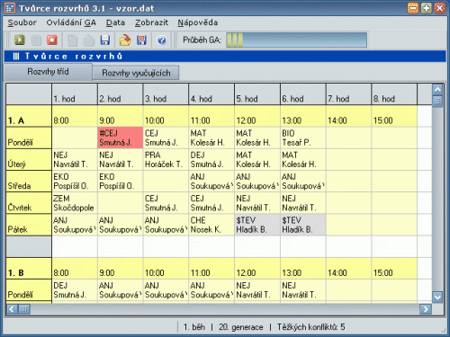 Program Tvůrce rozvrhů umožňuje plně automatickou tvorbu školních rozvrhů s využitím techniky genetických algoritmů. Výstupem programu jsou jednak rozvrhy hodin pro jednotlivé třídy, jednak rozvrhy učitelů. Vygenerované rozvrhy lze exportovat do HTML.