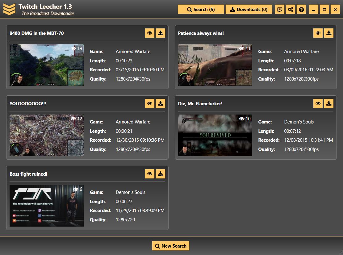 Twitch Leecher je malý a rychlý Twitch VOD download manažer. Lze v něm snadno vyhledávat aktuálně vysílané streamy nebo také ukončené vysílání za pomoci několika parametrů (kanály, URL adresy nebo ID). Stahovat můžete jakékoli veřejné video bez nutnosti přihlášení k uživatelskému účtu na Twitchi. Pouze pro stahování videí určených pouze pro odběratele je nutné být přihlášen. Než stahování započne, je nutné určit cíl uložení, kvalitu, cílový adresář a případný střih videa v určitých časech.