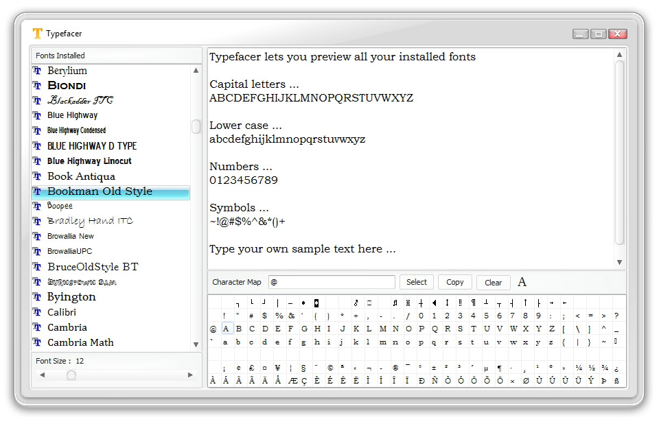 Typefacer je skvělý jednoduchý nástroj pro zobrazení všech fontů v počítači. Pro každý font zobrazí náhled několika písmen.