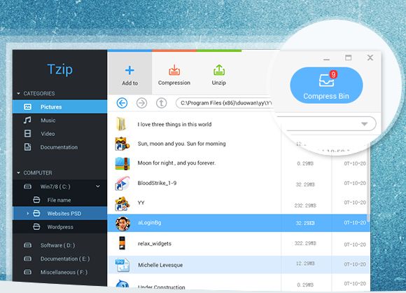 Tzip je přehledný program pro kompletní práci s komprimovanými archívy. Program podporuje komplexní správu archivů pomocí správce souborů, který obsahuje. Komprimovat lze jen do ZIP nebo 7-zip archivů, kdež to dekomprimovat můžete všechny níže uvedené soubory.
