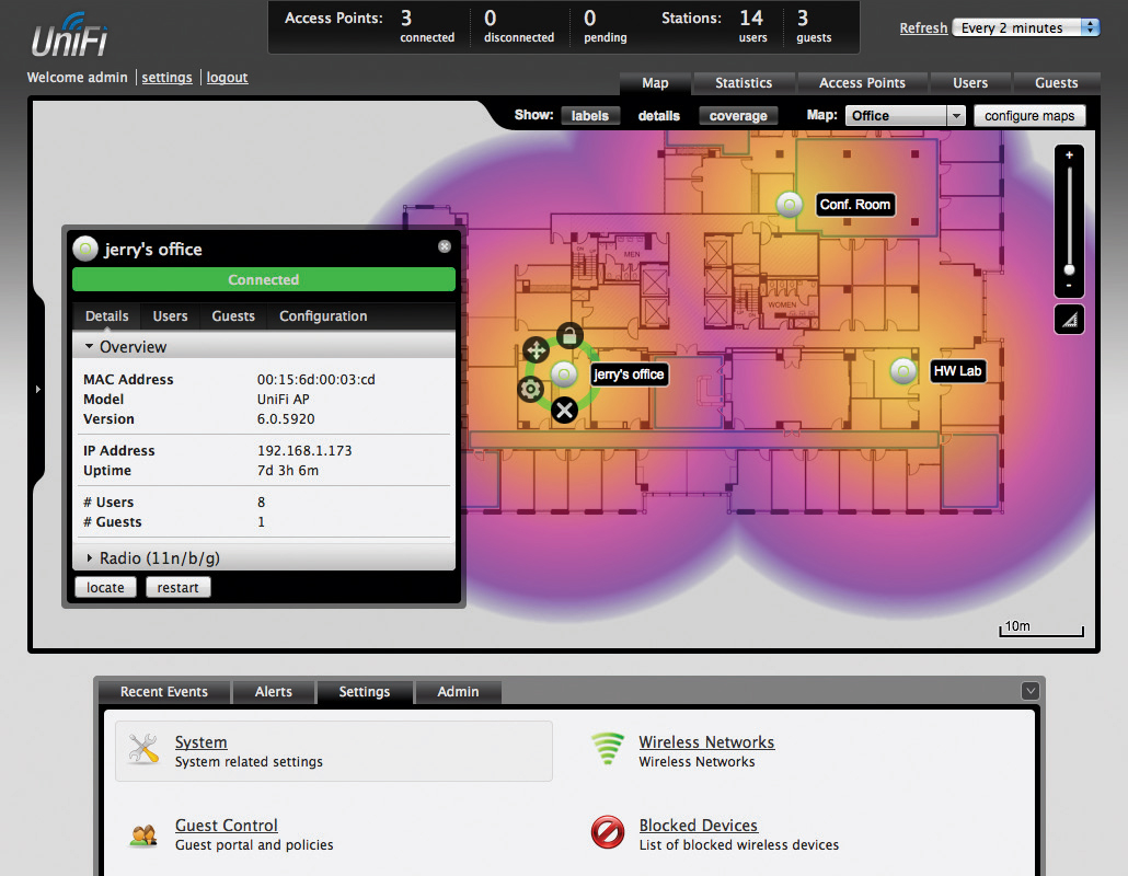 Ubiquiti UniFi je nástroj, ve kterém můžete spravovat bezdrátové přístupové body a monitorovat připojení v reálném čase. Identifikuje dostupná zařízení. V horní části stránky lze sledovat počet dostupných přístupových bodů, stejně jako množství stanic připojených k AP, které spravujete.