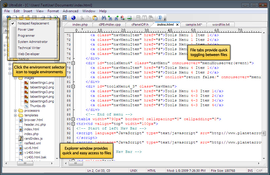 UltraEdit má všechny standardní funkce html editoru s kontrolou pravopisu, drag-and-drop, záložkou a dalšími...