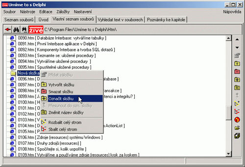 Na internetových stránkách www.zive.cz pravidelně vychází seriál o programování v Delphi, jehož autorem je ing.Václav Kadlec. Je to aplikace, pomocí níž lze snadno procházet jednotlivými kapitolami tohoto seriálu. Celý seznam kapitol je obsažen v základním stromu. Jednotlivé soubory kapitol jsou ve formátu [*.htm] a mají číslo dané kapitoly. Z toho plyne, že pokud nebudete využívat aktualizace pomocí tohoto programu, lze další kapitoly "ručně" přidávat stažením stránky pro tisk dané kapitoly nebo stažením všech potřebných souborů z adresáře htm na tomto webu. Bližší informace o off-line aktualizaci naleznete v podrobné nápovědě k programu.