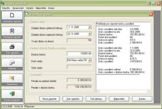 Oblíbený program pro výpočet zákonných i smluvních poplatků a úroků z prodlení. Nová verze vypočítá úrok z prodlení dle nařízení vlády č. 163/2005 Sb., kterým se stanoví výše úroků z prodlení a poplatku z prodlení podle občanského zákoníku.