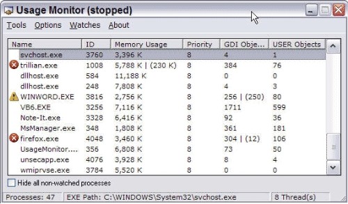 Usage Monitor je monitorovací nástroj pro sledování procesů probíhajících na vašem počítači. U každého procesu lze nastavit různé hodnoty a priority, využití paměti atd.