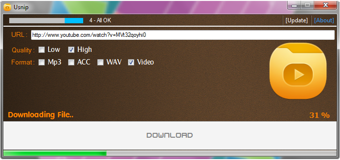 Usnip nabízí opravdu velmi jednoduché ovládání, kde pouze vložíte vstupní URL adresu, na které je video dostupné, zvolíte kvalitu a formát, v jakém chcete, aby se vám dané video stáhlo. Jsou tu na výběr formáty MP3, ACC, WAV, Video. Touto volbou uživatelské rozhraní končí. V jednoduchosti je krása.