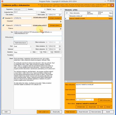 UtilStudio Pošta umožňuje vytvořit elektronický podací arch , evidenci, odesílání a archivování odeslaných podacích archů. Registratura dokumentů , evidence došlé a odeslané pošty, Podací deník - tisk. Import dat z externích účetních softwarových systémů Kros, Kros Plus, MRP, Pohoda a jiných s možností přizpůsobení se vašemu účetnictví. Export zásilek do online systémů České pošty a kurýrních služeb UPS, DPD, GLS, DHL a dalších