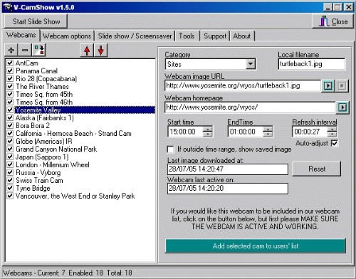 V-CamShow je skvělý nástroj pro tvorbu spořiče obrazovky, který zobrazuje snímky z jakékoliv webové kamery. Můžete si vytvořit seznam více kamer najednou a přídávat z různých částí světa. Stačí pak jen vybrat, kterou chcete, aby byla momentálně spuštěna a nastavit parametry.