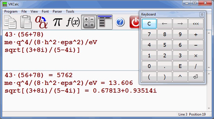 VKCalc je vědeckou kalkulačkou, která zpracuje a vyhodnotí matematický výraz ze vstupního pole. Kromě toho umí počítat i komplěxní čísla, matematicko-fyzikální konstanty a zvládne i uložení mezivýsledku do proměnných. Integrována je virtuální klávesnice a upravení uživatelského rozhraní.