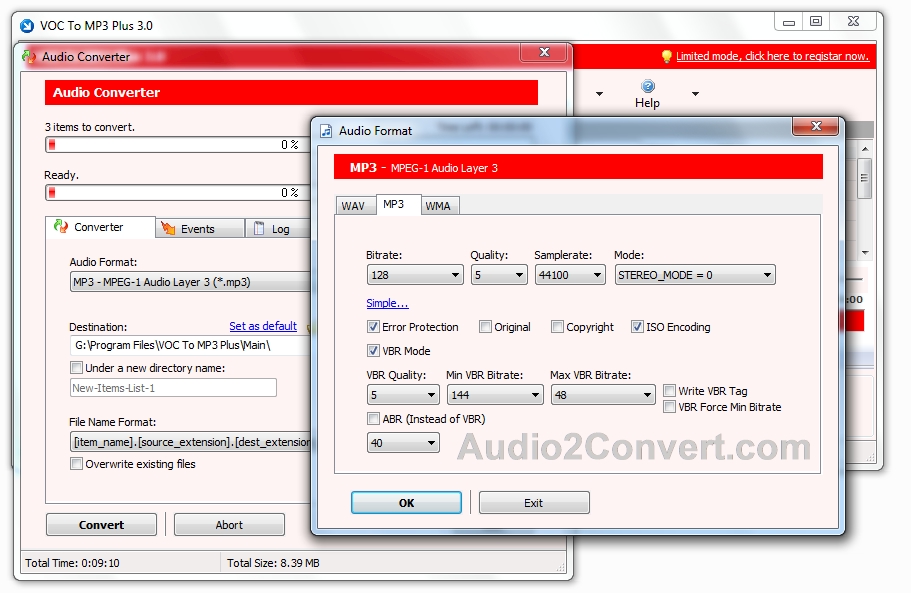 VOC To MP3 Plus umožňuje konvertování souborů VOC do MP3/WMA/PCM WAV souborů. Výsledek je ve vysoké kvalitě. Pomocí editoru, který program zahrnuje, můžete nastavovat rozsah pro zpracování, ID3 tagy a také získat informace o zdrojovým souboru.