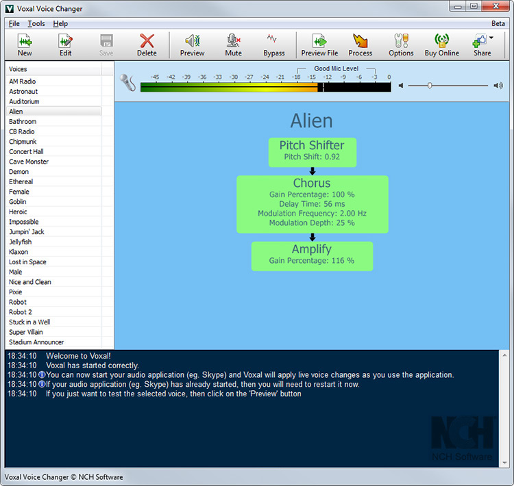 Voxal umožňuje změňit Váš hlas mnoha různými způsoby, přidáváním efektů, jako je například změna výšky nebo přidání ozvěny. Efekty lze stohovat v libovolném pořadí a kombinaci a poskytují tak téměř neomezené možnosti změny hlasu.