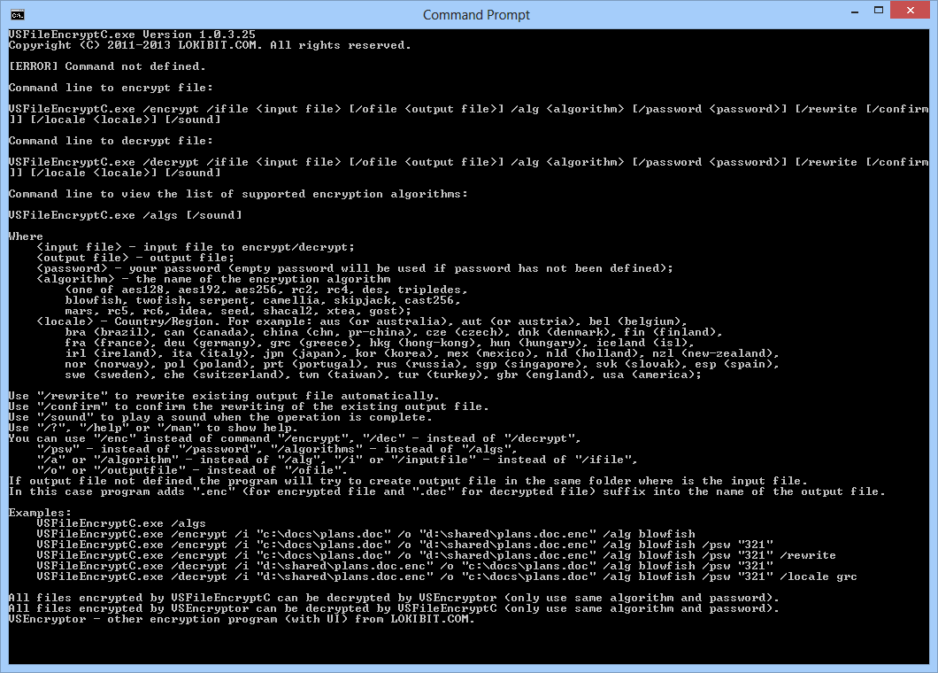 Stáhnout zdarmaVSFileEncryptC je sice malá, ale výkonná aplikace, která Vám pomůže snadno šifrovat a dešifrovat soubory. Jedná se o nástroj příkazového řádku, takže ti, kteří jsou zvyklí pracovat s příkazovým řádkem v systému Windows by neměli narazit na problémy s funkčností. Na druhou stranu, nezkušení uživatelé si budou potřebovat zvyknout na syntaxi, protože je docela intuitivní a jednoduchá. Vzhledem k tomu, že se jedná o aplikaci pro příkazový řádek, VSFileEncryptC může být spouštěn z USB flash disku. Tím pádem je vždy a všude k dispozici. Po spuštění stačí pouze vybrat zdrojový soubor, určit cíl a vybrat šifrovací algoritmus, který chcete použít, protože aplikace jich podporuje hned několik.
