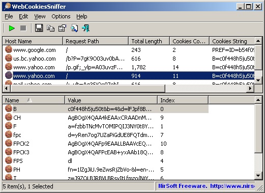 WebCookiesSniffer je aplikace, která Vám poskytne informace o všech souborech cookies uložených na Vašem disku při procházení internetem. Informace o zachycených souborech jsou zobrazeny v přehledné tabulce. Uvedena je URL adresa serveru, ze kterého cookies pochází, cesta odezvy, celková délka a řetězec. Tabulku je možné uložit do souboru nebo kopírovat prostřednictvím schránky windows.