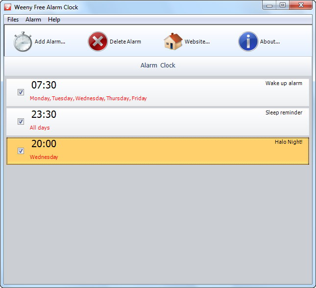 Weeny Free Alarm Clock je malý softwarový nástroj, který umožňuje uživateli nastavit více alarmů velmi jednoduchým způsobem. Uživatelské rozhraní je jednoduché. Můžete nastavit více alarmů, vše zobrazí v hlavním okně programu. Pro vytvoření nového budíku, existuje několik nastavení konfigurace zahrnuté v programu např. doba konfigurace, poznámky a zvuky. Opakování alarmu na vybrané dny je také možné ....