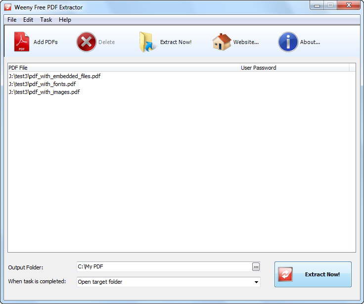Weeny Free PDF Extractor je jednoduchý nástroj, který extrahuje všechny obrázky, texty, písma z PDF dokumentů. Použití je velmi snadné. Stačí přidat soubory PDF do seznamu, vybrat výstupní adresář, a kliknout na tlačítko "Rozbalit" po spuštění jsou všechny obrázky, text, písma a vložené soubory ze souborů PDF extrahovány. Program nepřevádí soubory PDF do jiných formátů.