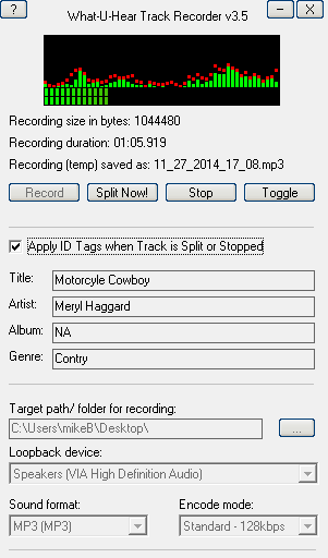 What-U-Hear Track Recorder je aplikace, určená k provedení záznamu audia z mikrofonu nebo reproduktoru. Zaznamenané audio se ukládá v různých souborových formátech jako MP3, WAV a OGG. V aplikaci si můžete vybrat mezi různými kvalitami (režimy kódování), a to v rozmezí od 64 do 320 kbps.