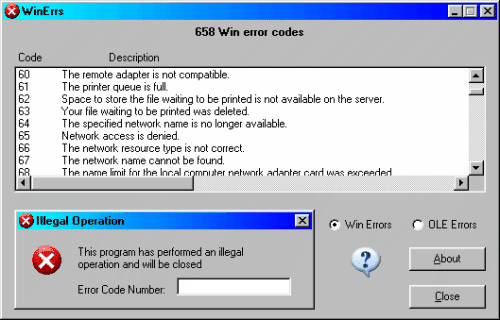 WinErrs je databáze až 1554 chybových "error" kódů Windows a jejich definic. Tyto kódy a popisy chyb jsou získány přímo z Microsoft Windows. Díky tomuto programy zjistíte příčinu a typ chyby a tak ji snadněji odstraníte.