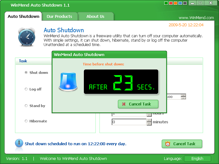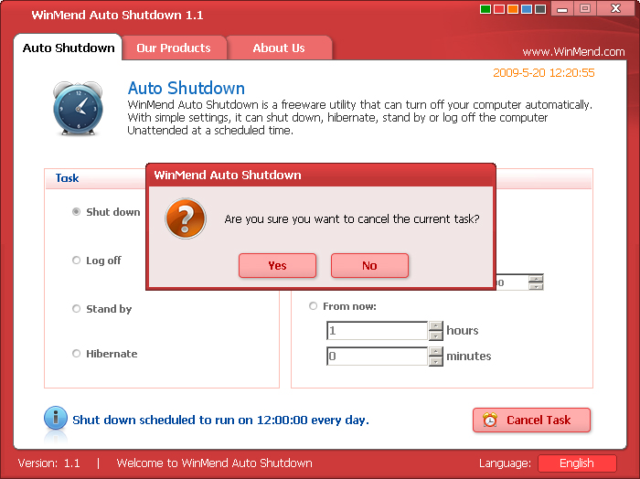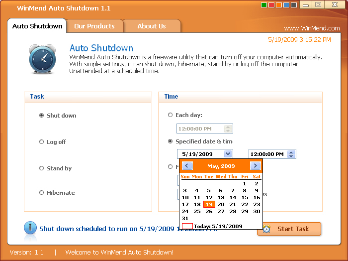 WinMend Auto Shutdown je bezplatný program, která umožní vypnout váš počítač automaticky. Pomocí jednoduchého nastavení může váš počítač vypnout, uvést do stavu hibernace či odhlásit v naplánovaném čase. V případě nastavení vypnutí se prográmek minimalizuje do systémové lišty.