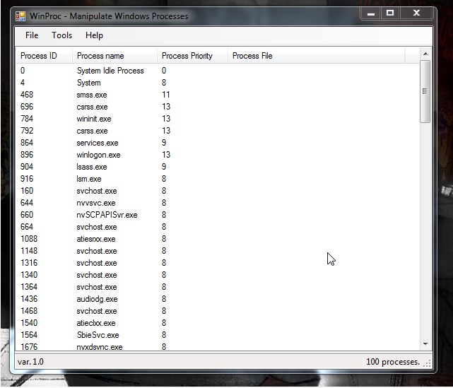 WinProc je systémová utilitka ke sledování aktivních běžících procesů. Zobrazuje PID (process ID), název procesu, prioritu procesu a umístění souboru na disku. Ve stavovém řádku je zobrazen počet běžících procesů.