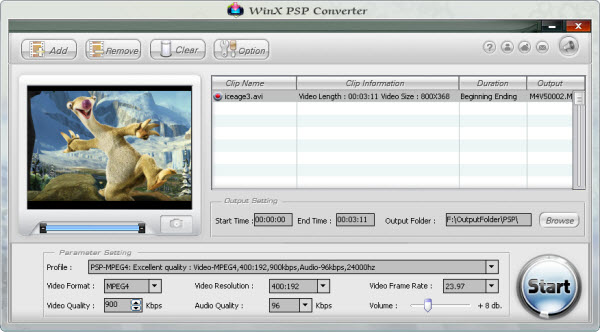 WinX free PSP video converter je další jedinečný bezplatný video konvertor, který slouží pro perfektní převod širokého rozsahu populárních video formátů, jako AVI, RMVB, FLV, WMV, ASF, VOB, MOV, MPEG1/2 do video formátu PSP (MPEG-4 AVC). Je to skvělý doplněk pro vaše PSP zařízení. Umožňuje velmi rychlou, hromadnou konverzi.