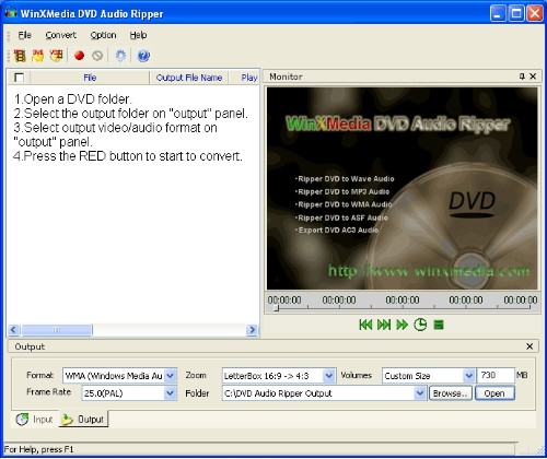 Winxmedia DVD Audio Ripper je šikovný nástroj, který umožňuje extrahování DVD audio ve vysoké kvalitě do WAVE, MP3, WMA 9 a ASF audio formátů. Podporuje MP3 s CBR i VBR a mnoho dalších módů kvality. Pracuje se soubory DVD, IFO a MPG/VOB.