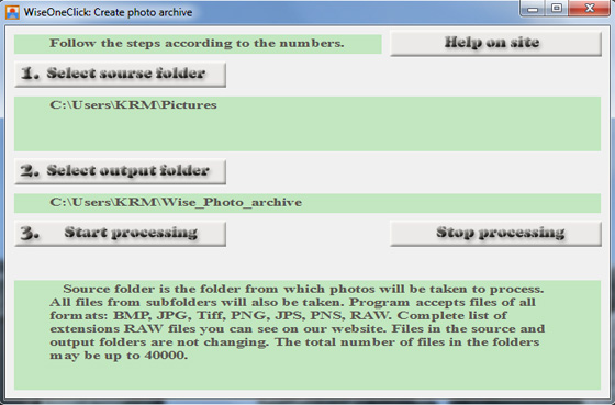 WiseOneClick je jednoduchý nástroj k organizování vaší sbírky fotografií. Vytvoří seznam, přejmenuje soubory a převádí soubory RAW do formátu JPEG. Program podporuje soubory všech formátů: BMP, JPEG, TIFF, PNG, JPS, PNS, RAW. Soubory ve zdrojové a výstupní složce se nemění. Celkový počet souborů ve složkách, může být až 40000.