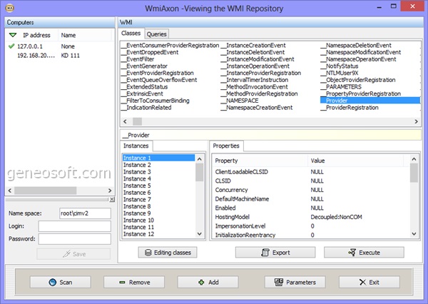 WmiAxon je bezplatný program, který Vám umožní sledovat počítače v síťových prostředích s povolenou WMI službou. Správce vybere třídy WMI ze seznamu nebo vytvoří jednoduchý WQL dotaz, čímž ze seznamu instancí a vlastností, můžete vytvářet zprávy ve formátech PDF, XLS, XML.