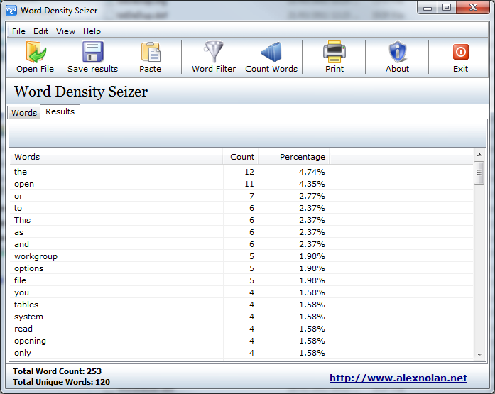 Po vložení textu do dialogového okna programu klikněte na tlačítko "Count“ na panelu nástrojů, aby jste zobrazili výsledky o textovém zápisu. Výsledky lze vytisknout klepnutím na tlačítko "Print“. Ve stavovém řádku v dolní části obrazovky můžete vidět celkový počet slov textu a také počet nejopakovanějšího slova.