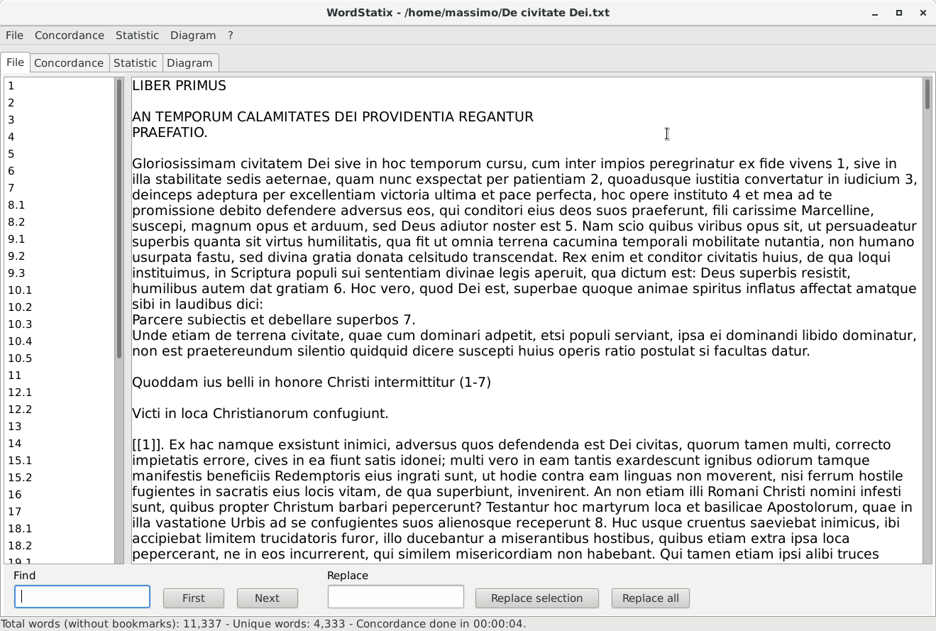 Stáhnout zdarmaWordStatix je aplikace pro vytváření konkordancí a následně jejich analýzu. Provádí vyhodnocení využití slov v rámci celého dokumentu. Na základě nasbíraných informací je schopen generovat grafy a statistiky. Konkordance jsou seznamy slov použité v dokumentu, spolu s jejich opakováním a kontextem. Dokumenty lze jakkoli seřadit například do kapitol, případně číslováním nebo jiným způsobem.