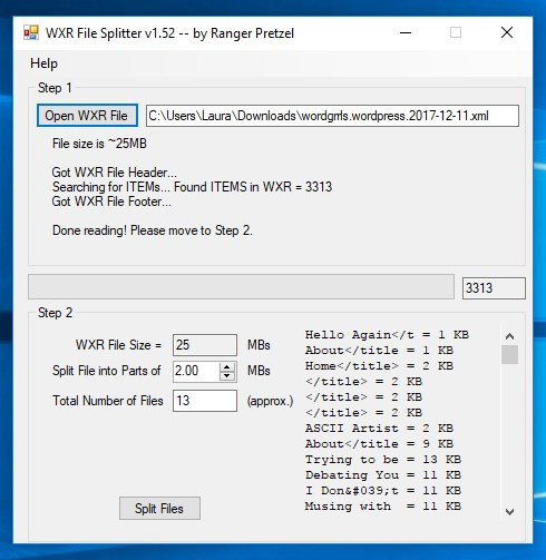 WXR File Splitter je nástroj, který vám pomůže rozdělit velký WXR soubor na více částí. WXR soubory se používají pro zálohování a import dat WordPressu. Velikost importovaného WXR souboru je omezena nastavením WordPressu. WXR File Splitter vám pomůže obejít toto omezení rozdělením velkého souboru na více částí.