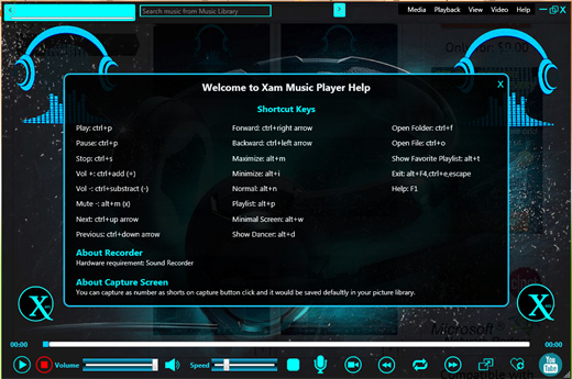 Xam Music Player je moderní hudební přehrávač a organizér knihovny. Xam Music Player je multiplatformní hudební přehrávač. Je zaměřen na rychlé a snadné použití rozhraní pro vyhledávání a přehrávání hudby, Xam Music Player je jedním z populárních hudebních přehrávačů. Tento program vám umožní přidat zvukové soubory, které jsou ve Vašem počítači do hudební knihovny. Můžete procházet a sledovat videa v internetovém obchodě. Poskytuje také audio, video a snímání obrázků.