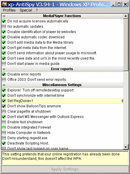 XP-AntiSpy je velmi užitečný program, který slouží pro vypínání nebo zabranění různých funkcí Windows XP, které nám microsoft nastavil natvrdo a je pro nás obtížné se jich zbavit. Lze vypnout např.: automatické aktualizace různých programů, funkce zpomalující systém počítače, lze odinstalovat MSN Messenger atd.