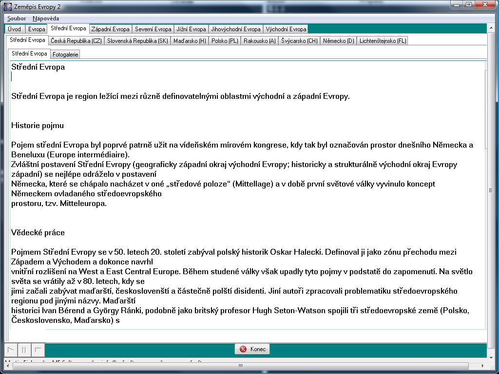 Jedete někam do ciziny po Evropě a potřebujete se o dané zemi něco dozvědět? Vytvořený český program od MF Software obsahuje 166 článků a více než 550 obrázků. Program je zejména vytvořen pro školy ale i pro obyčejné rodiny. Asi 30 článku je již namluvených Program lze využít pro referáty, ale i pro učení. V současné době se vytváří nová verze. Do budoucna se plánuje kompletní namluvení celého programu. Nová verze Zeměpis Evropy 2.5 lze stáhnout jenom na hlavních stránkách MF Software (stránky výrobce)! Nová verze obohacená o nový design a nové dialogy. Chtěl bych upozornit na program Spolupráce, o kterém se více dozvíte na stránkách výrobce. V tomto programu pomůžete tvorbě podobných programů. Více informací na uvedené adrese.