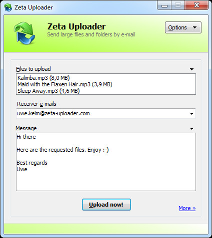Zeta Uploader je ideální pro sdílení velkých souborů, které by bylo problematické nebo nemožné posílat e-mailem. Soubory můžete komprimovat do ZIP formátu pro snadnější přenos a sdílení. Zeta Uploader také umožňuje přidat zprávu do editačního okna, abyste mohli adresátovi poskytnout nějaké informace o souboru.