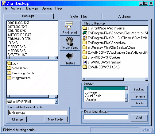 Zip Backup je velmi šikovná zálohovací utilita, s jejíž pomocí můžete pravidelně provádět backup jak Vámi zvolených souborů tak rozhodujících částí systému. Mnoho uživatelů se zálohování vyhýbá zejména z důvodu složitosti některého zálohovacího softwaru. Tento program (jak uvádí výrobce) byl navržen a koncipován tak, aby se tomuto problému vyhnul. Cílem bylo vytvořit program, s kterým provedete zálohu systému, mailů, kontaktů, dokumentů, her,... několika málo kliky. Jak již sám název napovídá, tak jsou zálohované soubory komprimovány (zabaleny) do Zipu. V programu je možno vytvářet určité skupiny souborů pro zálohu. Systémové soubory a registry jsou archivovány separátně.