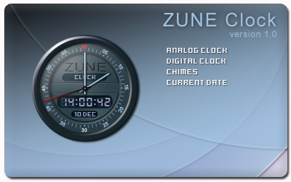 Zune Clock jsou desktopové analogové/digitální hodiny s aktuálním datem. Hodiny doplňuje pěkná zvonkohra.